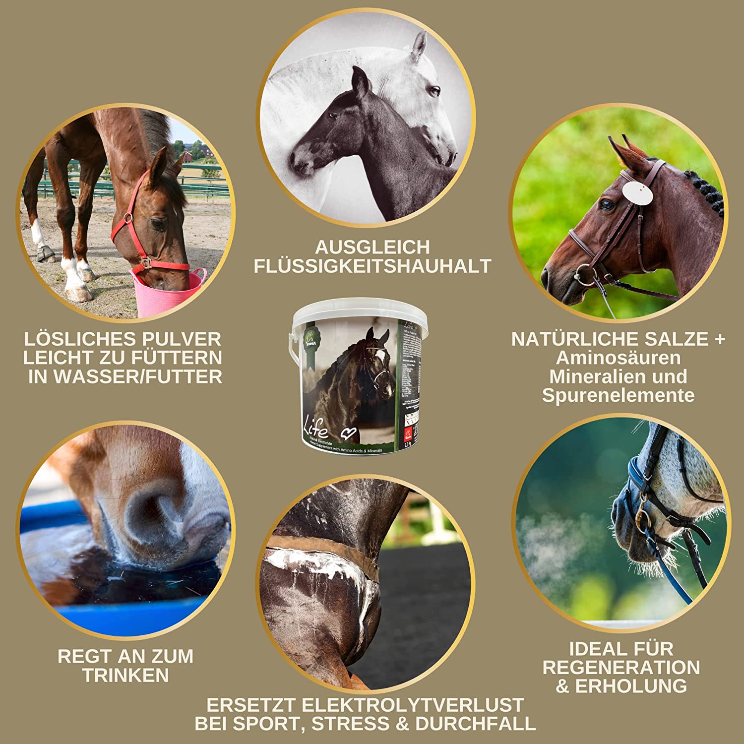 - Life (Pulver): als natürliche Elektrolytlösung (z. B. ins Wasser) oder über das Futter. Bitte Etikett/Herstellerangaben beachten.