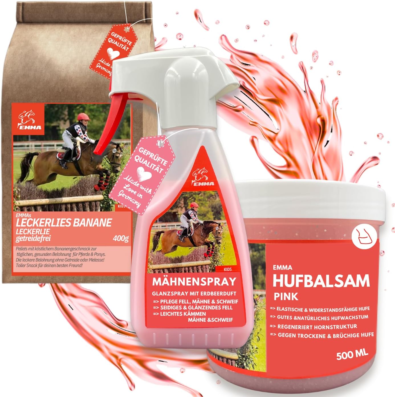 EMMA Pferdepflege-Set für Kinder – 3-teilig (Huffett pink, Mähnenspray/Glanzspray, Leckerlis)