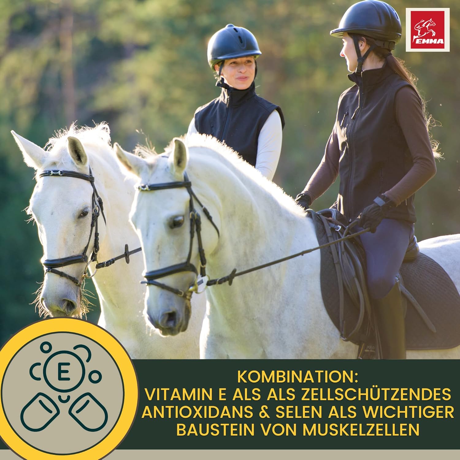 Hochwirksame Kombination zur Unterstützung von Muskelstoffwechsel & Zellschutz. Vitamin E puffert oxidativen Stress, Selen wirkt synergistisch, Lysin ergänzt als essentielle Aminosäure. Empfehlung bei Stresssituationen wie Impfung, Transport, Hitze und intensiven Trainingsphasen. -