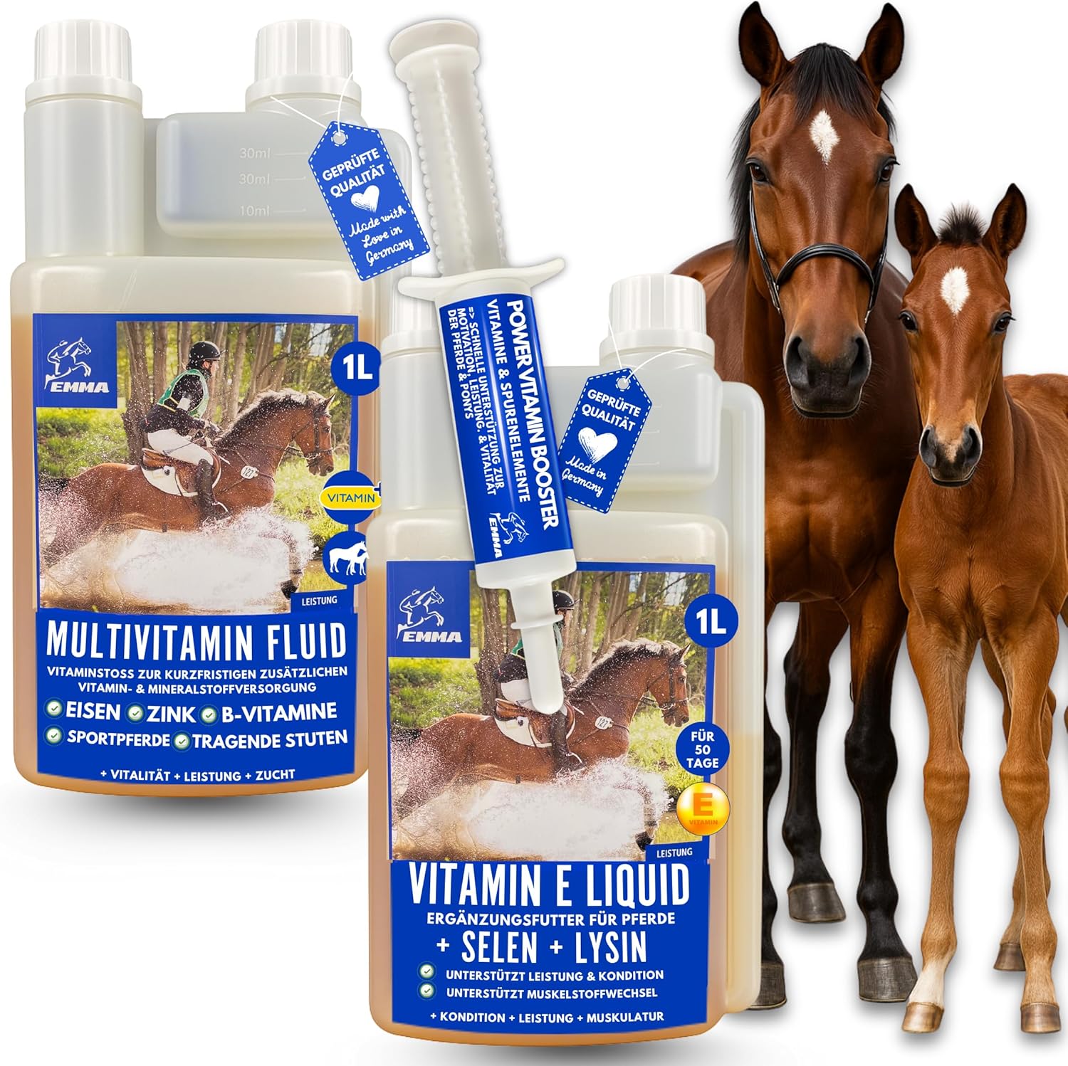 - Schnell + nachhaltig: Flüssige Basisversorgung (Multivitamine & Zink) + gezielte Muskelunterstützung (Vitamin E/Selen/Lysin) + kurzfristiger Leistungs-Booster (Oralpaste).
