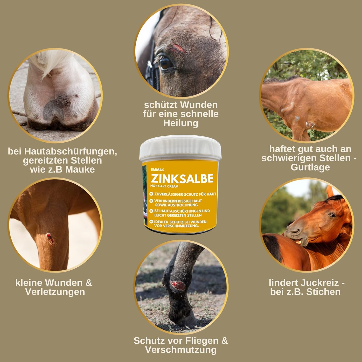 Die EMMA Nº 1 Care Cream ist eine hochwertige Zinksalbe für Pferde, Hunde und Katzen. Sie schützt zuverlässig vor Nässe und Schmutz, pflegt gereizte Haut und unterstützt die natürliche Wundheilung. Ideal bei Mauke, Ekzemen, Schürfwunden, Juckreiz oder rissiger Haut.